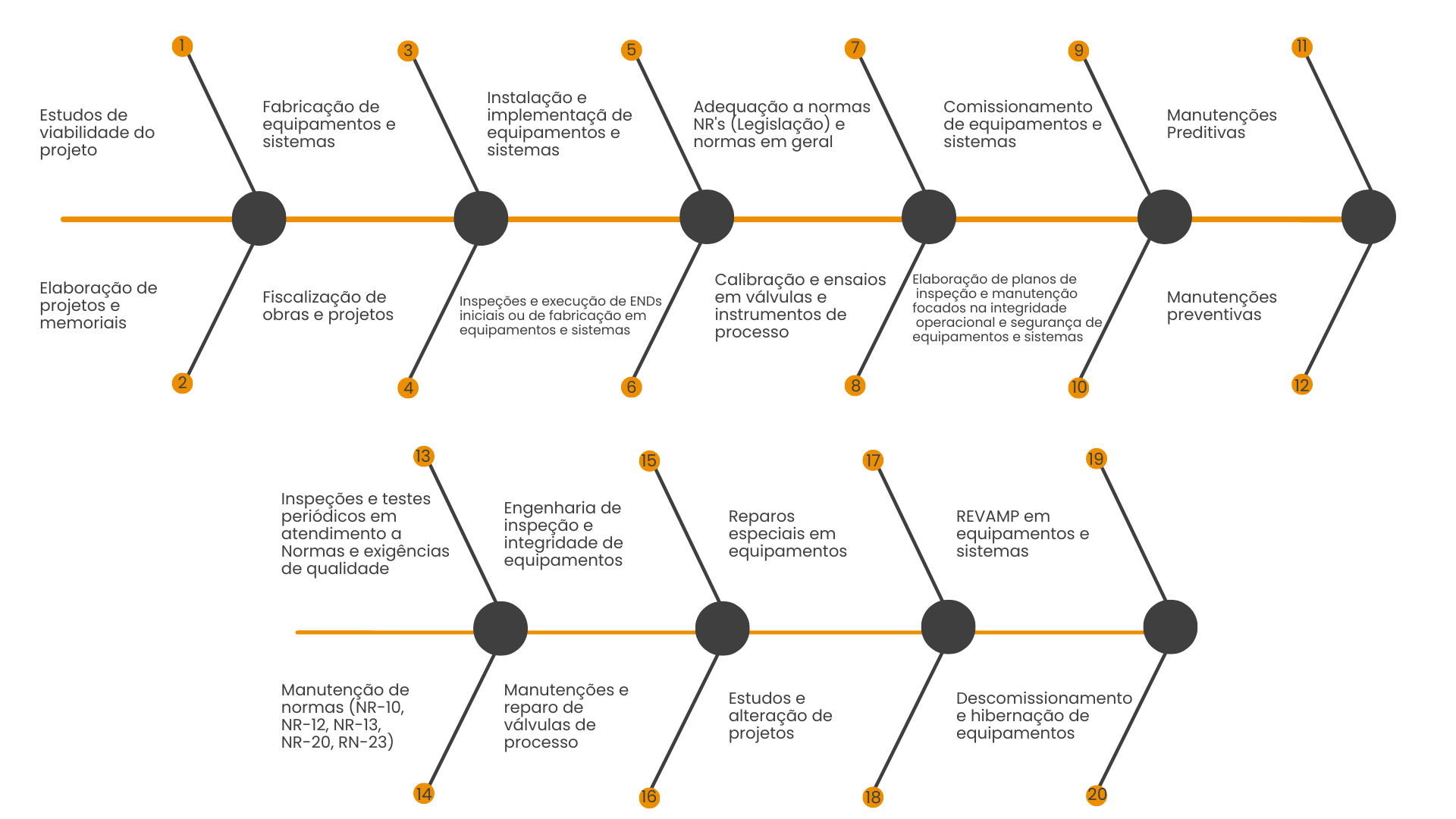 Aplicamos o diagrama Espinha de Peixe para organizar nossos processos, onde cada fase é cuidadosamente mapeada para assegurar que todos os aspectos do projeto sejam tratados com rigor técnico e em conformidade com as normas.